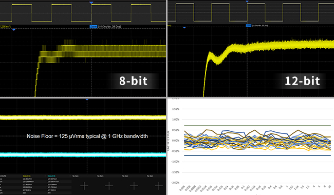 高分辨率示波器能有效提高信号测量精度。传统8-bit分辨率示波器的量化等级为256,而12-bit分辨率的量化等级为4096,这意味着测量电压为1V的信号,12-bit下可测得的最小信号幅度为1/4096V,而8-bit只有1/256V。12-bit分辨率可达到传统8-bit的16倍,这将信号的测量精度提升了一个量级。