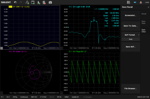 SNA5000A支持在多个窗口下,添加多条迹线进行S参数测量。并且测量结果,可以多种数据格式显示,如 Log Mag,Lin Mag,Phase,Delay,Smith,SWR,Polar等,可以方便快捷地分析被测物的传输系数,反射系数,驻波比,阻抗匹配,相位,延时等参数。