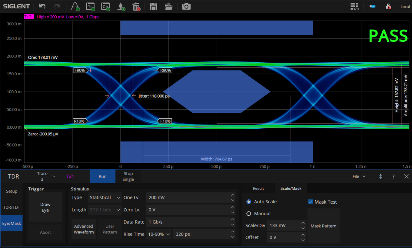 眼图可以反映信号链路上传输的数字信号的整体特征,从中观察出码间串扰和噪声的影响,进而估计系统的优劣程度。因此,眼图分析是高速系统信号完整性分析的核心。SNA5000A搭载了眼图功能,为需要对高速信号进行时域分析的客户节省了大量成本和时间。