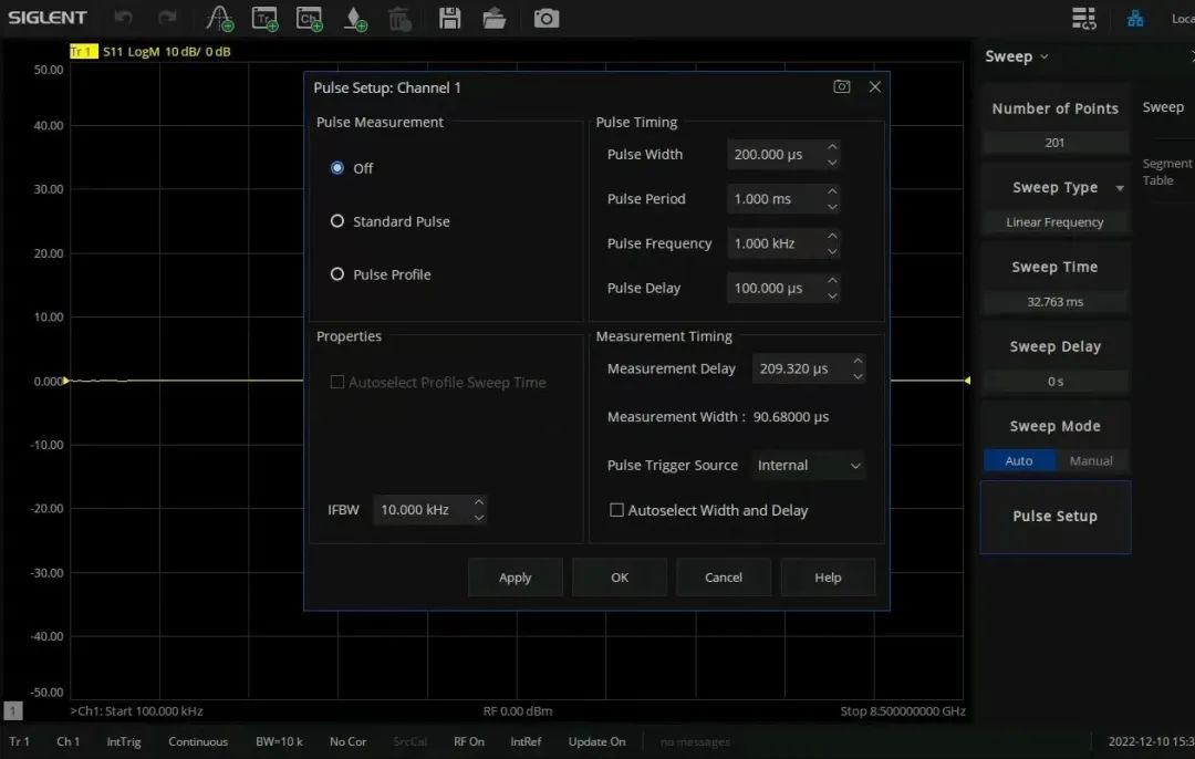 SNA6000A内置脉冲调制器和脉冲发生器应用于测试诸如功率晶体管之类的大功率被测器件,以及需要工作在脉冲模式下的模块。连续波激励所积累的热量可能会损坏被测器件,而使用脉冲激励进行测量可以安全地对这类器件的特性进行表征,同时也支持控制外部脉冲生成器和调制器,与外部主脉冲保持同步。