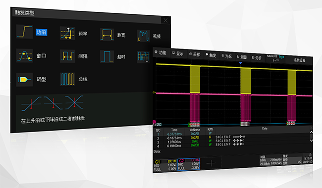 SDS800X HD具有丰富的触发功能,包括边沿、斜率、延迟、建立/保持时间和多种总线触发(串行触发)。