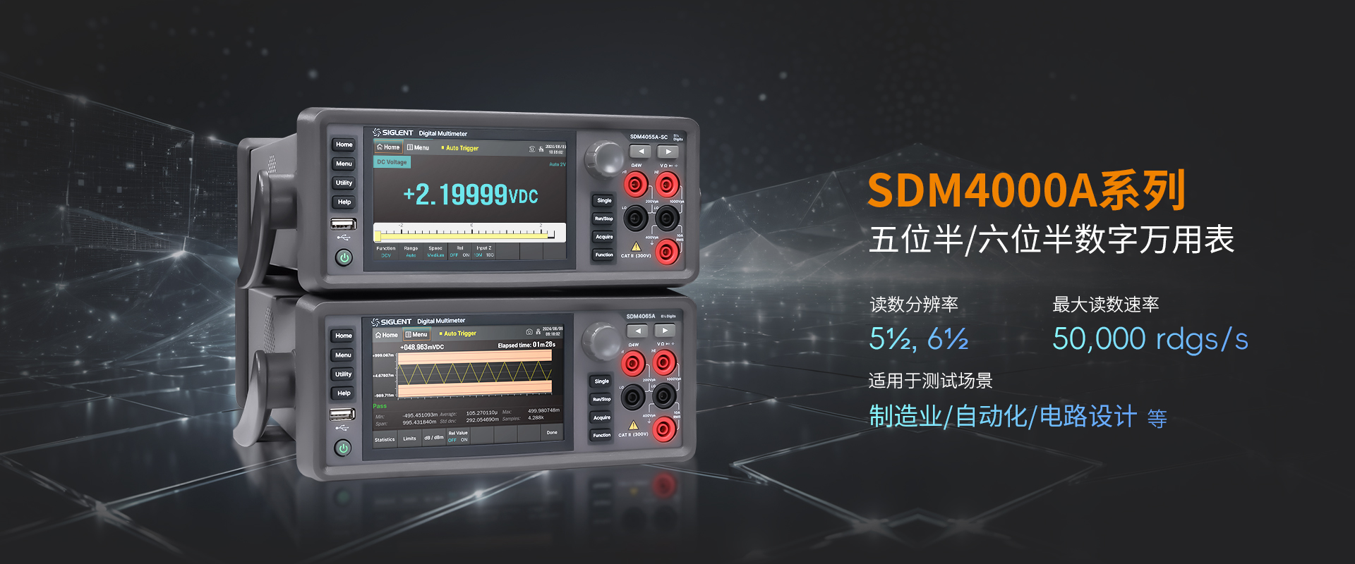 SDM4000A高速五位半、六位半万用表在速度、准确度和稳定度之间实现了平衡。无论在自动化控制系统测试、电力工程、电子制造与维修、通信与网络,还是科研与教育等领域,SDM4000A系列万用表都致力于为工程师提供全新的测量体验,实现更精确高效的测试