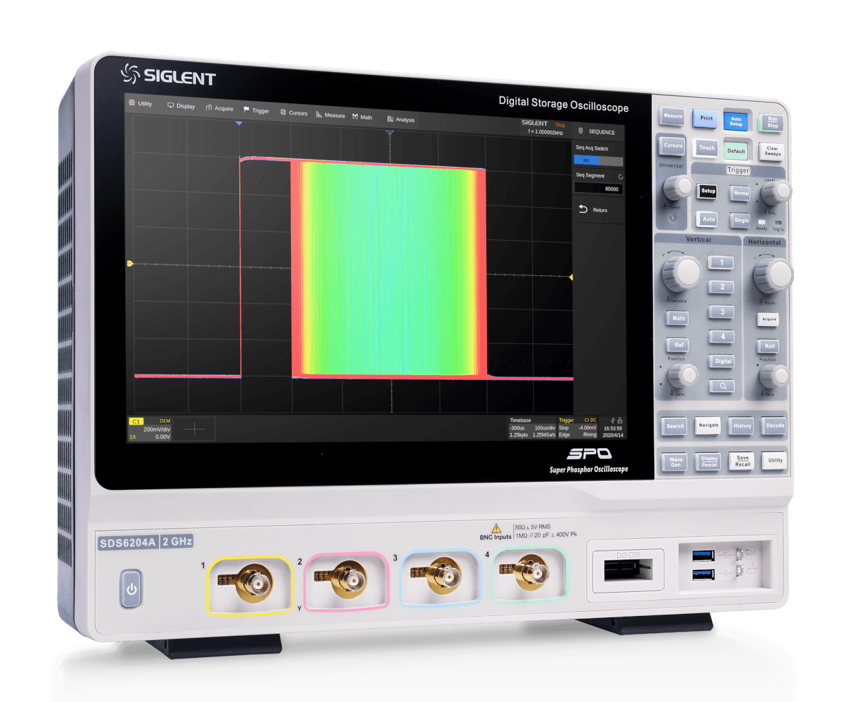 SIGLENT’s SDS6000A series Digital Storage Oscilloscopes are available in bandwidths of 2 GHz, 1 GHz, and 500 MHz, have a sample rate of 5 GSa/s (10 GSa/s ESR) at each channel, a maximum record length of 500 Mpts, and display up to 4 analog channels + 16 digital channels mixed-signal analysis ability.
