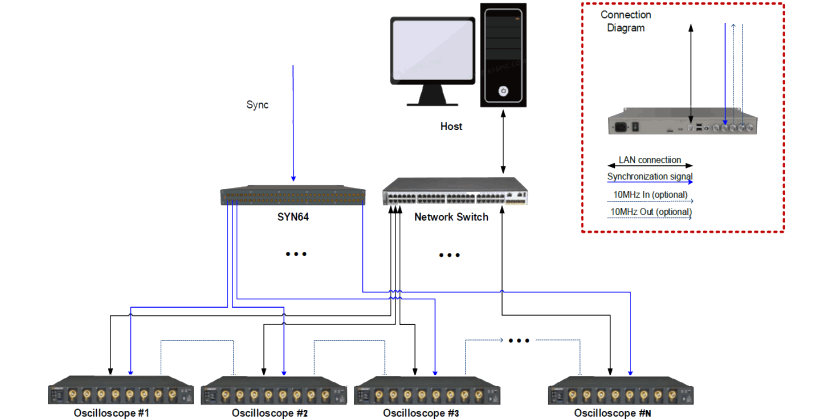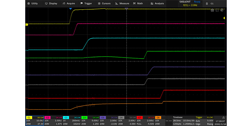 SDS5000L are available in 8 channels, bandwidths of 350 MHz, 500 MHz and 1 GHz, have 12-bit ADCs with sample rate up to 5 GSa/s, maximum record length of 2.5 Gpts/ch. Multiple SDS5000L modules can be synchronized using a 64-channel distributor (SYN64) to form a high-channel-count acquisition system scalable up to 512 channels.