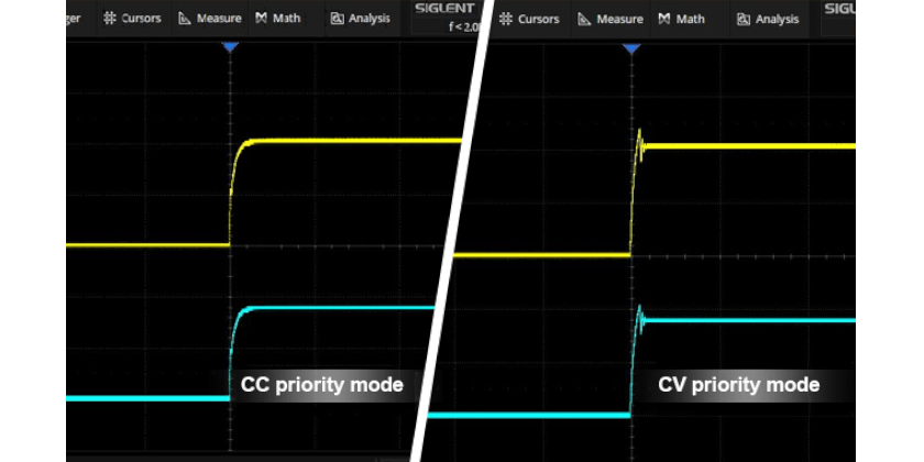 In CV priority mode, the output voltage reaches the set voltage value quickly. In some applications, such as LED testing, when the power output is started, the surge current and overshoot voltage will appear when the voltage reaches the on-state voltage of the LEDs.