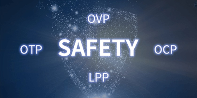The protection functions of the power supply include over current protection (OCP), over voltage protection (OVP) and over temperature protection (OTP).