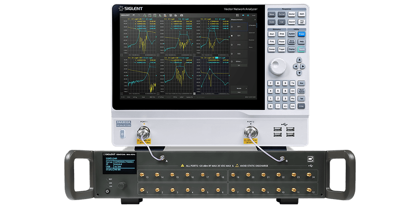 SSM5000A series switch matrix can expand the number of test ports of network analyzer, signal source, spectrum analyzer and other equipment. And the series are with up to 4 input ports and up to 24 output ports, supporting USB, LAN, Direct Control communication modes. The Direct Control interface on the switch matrix can further expand the number of test ports and support a simplified multi-port calibration algorithm, which can greatly improve the efficiency of calibration. In addition to SIGLENT instruments, it also supports other mainstream instruments. It is suitable for 19-inch standard chassis and can be widely used in multi-port test environments such as antennas and 5G component modules.