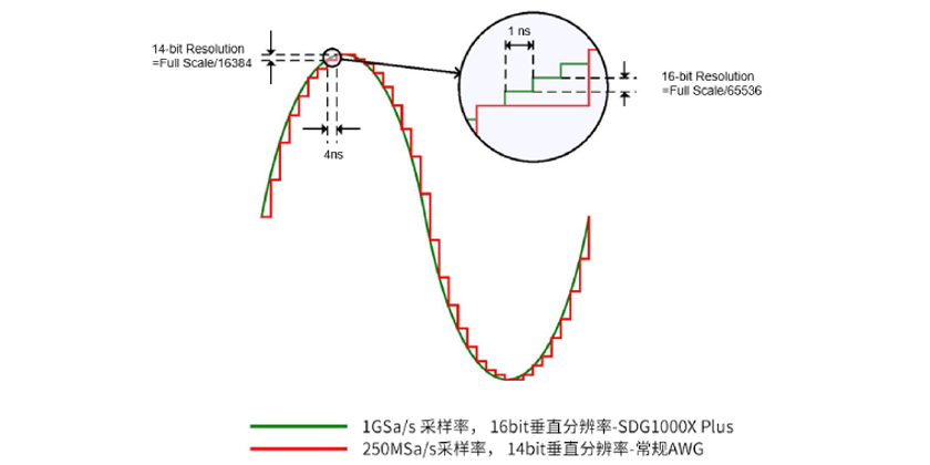 SDG1000X Plus具备16-bit垂直分辨率,可确保信号细节的精准捕捉。同时还具有卓越的采样性能,其高达1GSa/s的采样率是同类型产品的数倍。采样率是DAC在给定时间间隔内采样的样点数量,采样率越高,在相同频率下能够获取到更为丰富的信号细节,波形质量越好。