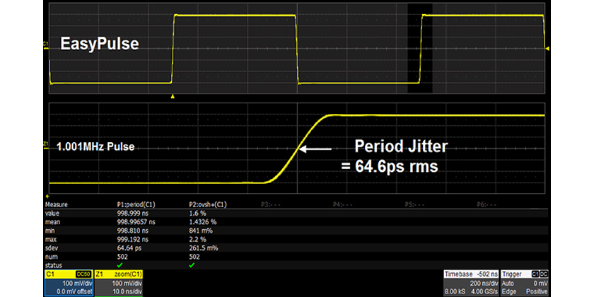 DDS方法输出方波/脉冲时, 如果采样率和输出频率不成整数倍关系,将产生一个采样周期的抖动。采用EasyPulse技术可克服这个缺陷;产生低抖动的方波和脉冲信号,此外还具有以下优势: