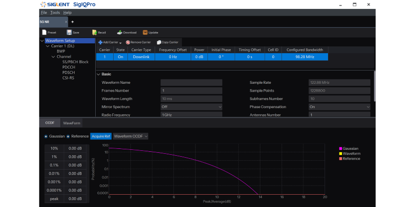 • 内置3GPP标准定义的NR参考测量信道(RMC)、固定参考信道(FRC)及Test Model测试模式参数预设