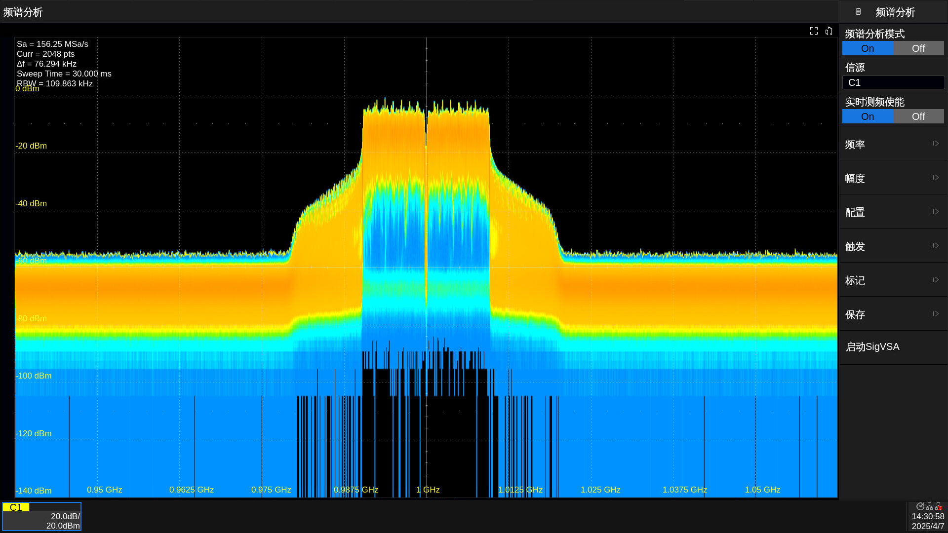SDS7000A示波器集成了RTSA功能,在频谱分析模式下,支持实时频谱仪(RTSA)和数字下变频(DDC),最大1GHz的分析带宽,并具有密度图,频谱监测,3D图,3D图+频谱监测,密度图+频谱监测显示方式,能够在频域实现较高精度的测量,与传统的超外差式结构频谱分析仪相比有着更高的带宽和更高速的ADC,可以极佳的捕获瞬态毛刺信号。