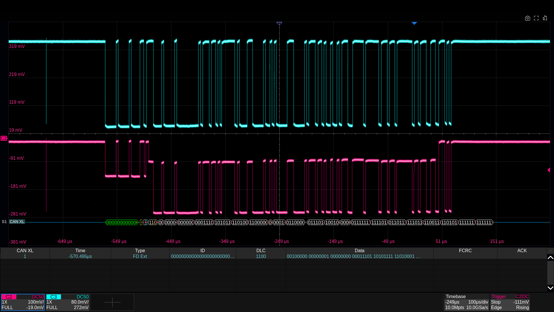 SDS7000A系列示波器全面支持 CAN XL 解码,结合已有的 CAN/CAN FD 解码能力,实现对 CAN 协议(10 kbps 至 20 Mbps)的全场景覆盖;兼容低功耗模式与高速模式,灵活适配于工业控制、智能驾驶等严苛场景。SDS7000A配备了16通道(4路模拟通道C1-C4与12路数字通道 D0-D15),支持同步解析,可精准捕获数据冲突、信号反射等异常,助力工程师高效应对复杂总线调试挑战。
