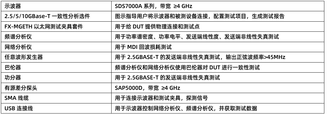 2.5/5/10GBase-T以太网一致性测试所需设备包括高带宽示波器、示波器分析软件、矢量网络分析仪、频谱分析仪、波形发生器、标准测试夹具、巴伦器、功分器以及探头。