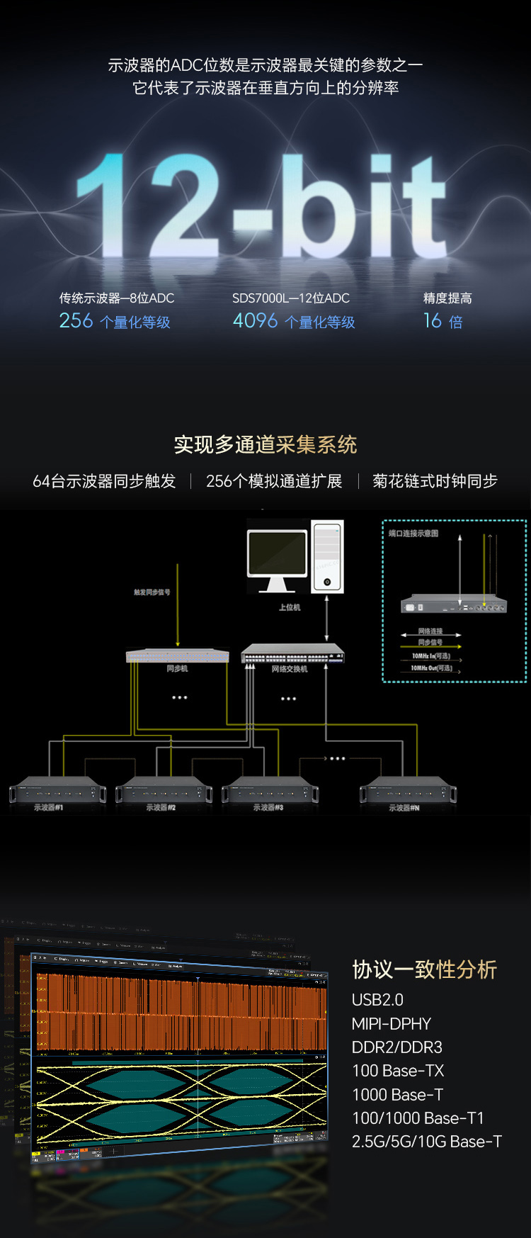 2025年5月27日,优米平台发布了SDS7000L紧凑型数字示波器,其采用2U紧凑设计,支持机架/桌面双模式安装使用。SDS7000L模块化的架构便于组建多通道采集系统,通过同步机可实现64 台示波器的精准触发同步采集,灵活扩展至256个模拟通道,尤其适合大规模信号阵列的同步监测场景。